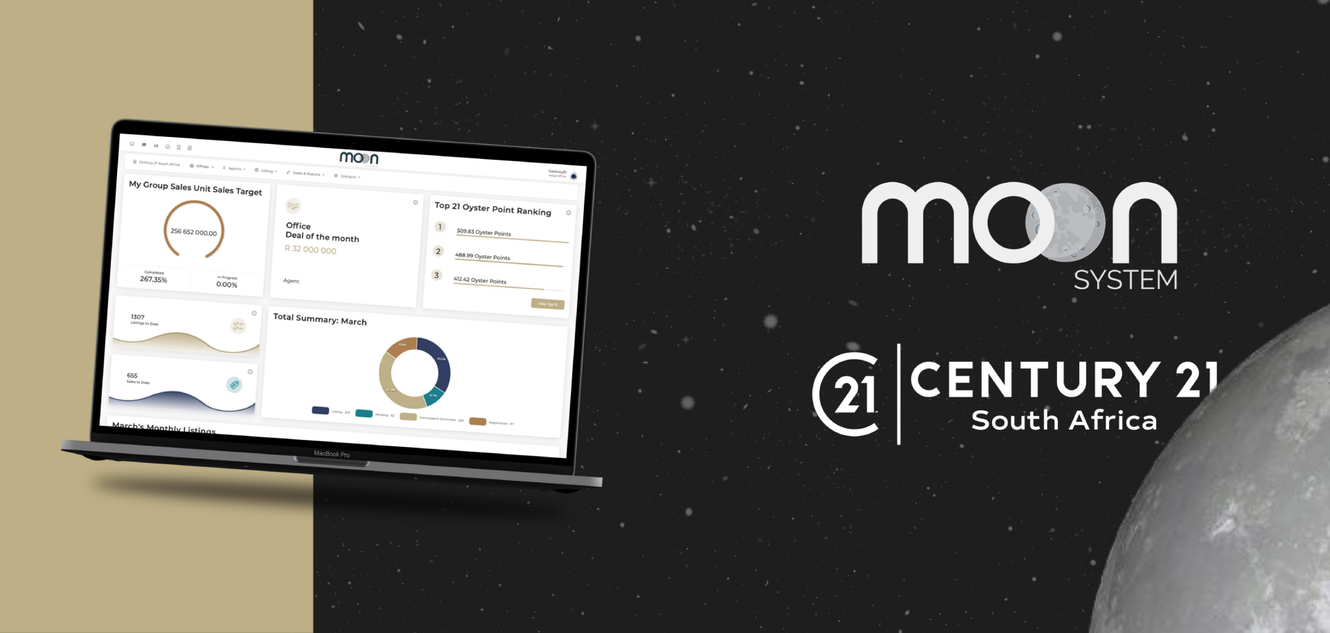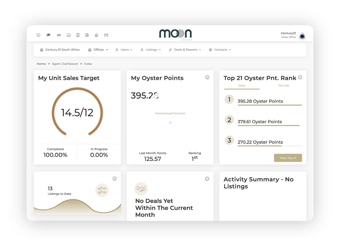 Century 21’s Oyster Points system encourages agents to outsell their peers for a Pearl Award. MOON implements this system, keeps track of sales, and creates a leaderboard of top-performing agents.